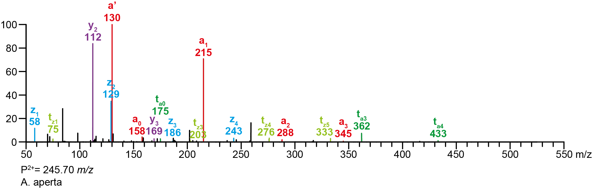 | The spider Paracoelotes birulai: Detection and structural elucidation of new acylpolyamines by on-line coupled HPLC-APCI-MS and HPLC-APCI-MS/MS | S. Chesnov, L. Bigler, M. Hesse, Helv. Chim. Acta 2000, 83, 3295-3305 | A. aperta | AG 489 | APCI-MS/MS | Link |